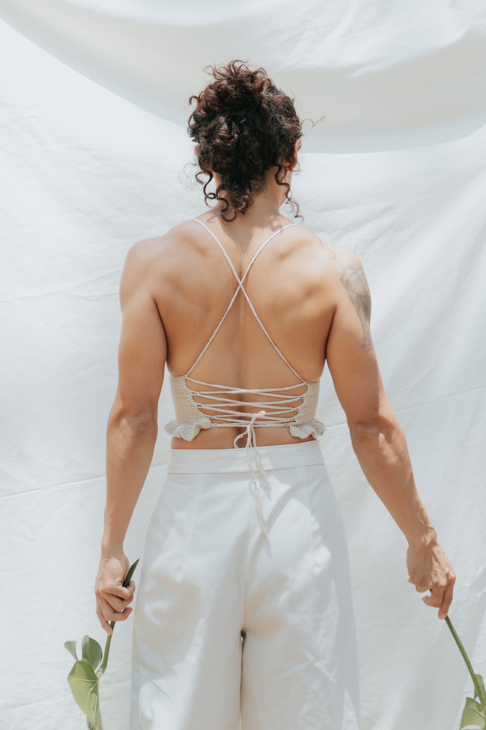 Hecho totalmente a mano con la técnica de crochet, cuenta con un volante en la parte inferior con chaquiras bordadas que le darán un toque único. Tiene un cierre en la espalda mediante un lazo y su diseño cuenta con copas para que te sientas cómoda y libre. ¡Haz de tu look algo especial y único con esta hermosa prenda!